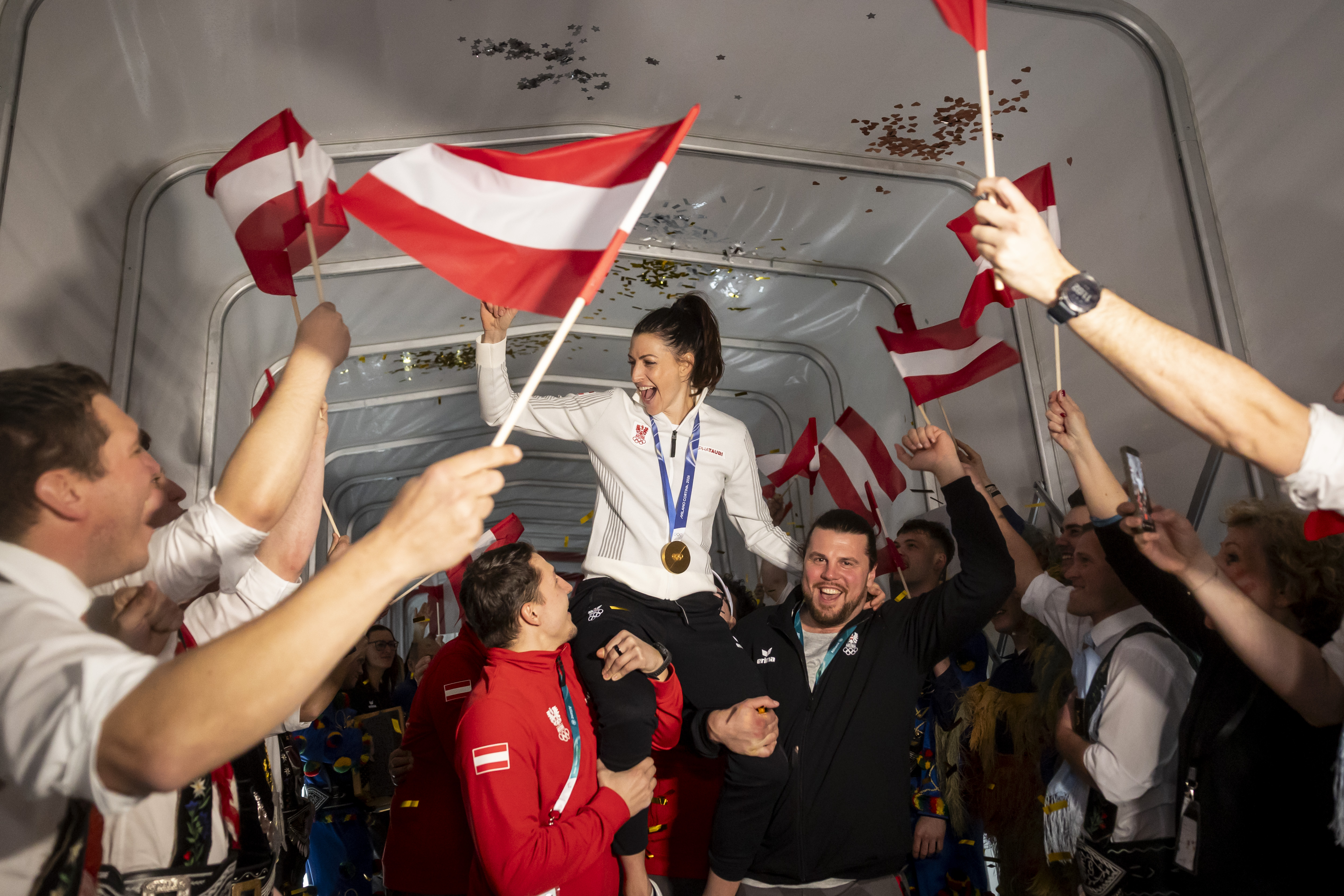 Der sportliche Höhepunkt des Tages war der Erfolg von Janine Flock, die sich im Skeleton Bewerb zur Olympiasiegerin kürte. „Ich habe nie aufgegeben und im Laufe meiner langen Karriere viele Höhen und Tiefen erlebt. Das hat mich zu dieser Person gemacht, die ich heute bin“, jubelte Flock nach dem Triumph. Mit ihrer Familie feierte die Ausnahmeathletin im Austria Tirol House, wo auch viele Vertreter:innen aus Wirtschaft und Politik ihre außergewöhnliche Karriere bejubelten. Der Auftritt der Rumer Muller brachte schließlich ein Stück Tiroler Tradition und veredelte die emotionale Goldfeier von Janine Flock im Austria Tirol House. Ausdauer, Ehrgeiz und Können – der Sieg von Flock passte bestens zum Gipfeltreffen der Wirtschaft, das von der Standortagentur Tirol an diesem Tag organisiert worden war. So wurde perfekt symbolisiert, wie eng sportliche Spitzenleistung und wirtschaftliche Innovationskraft verbunden sind.