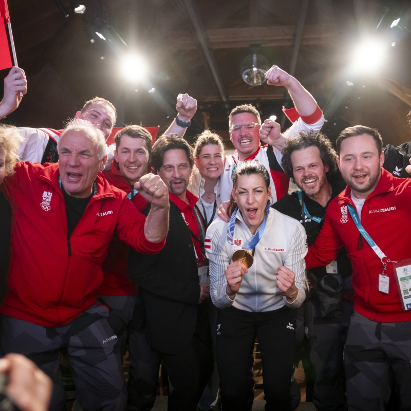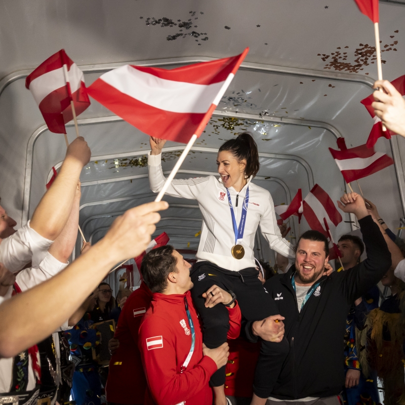 Bei der Ankunft der Tiroler Olympiasiegerin Janine Flock bebte das Austria Tirol House.