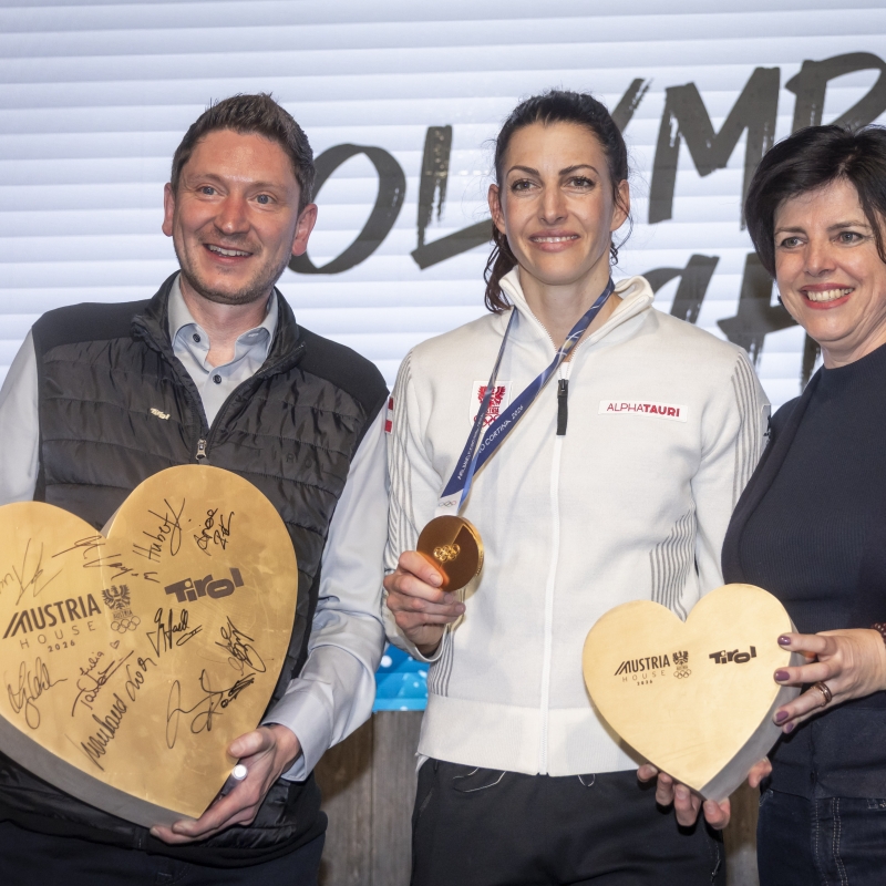 Mit der strahlenden Tiroler Goldmedaillen-Gewinnerin Janine Flock: Martin Reiter (Geschäftsführer Lebensraum Tirol Gruppe) und Karin Seiler (Geschäftsführerin der Tirol Werbung).