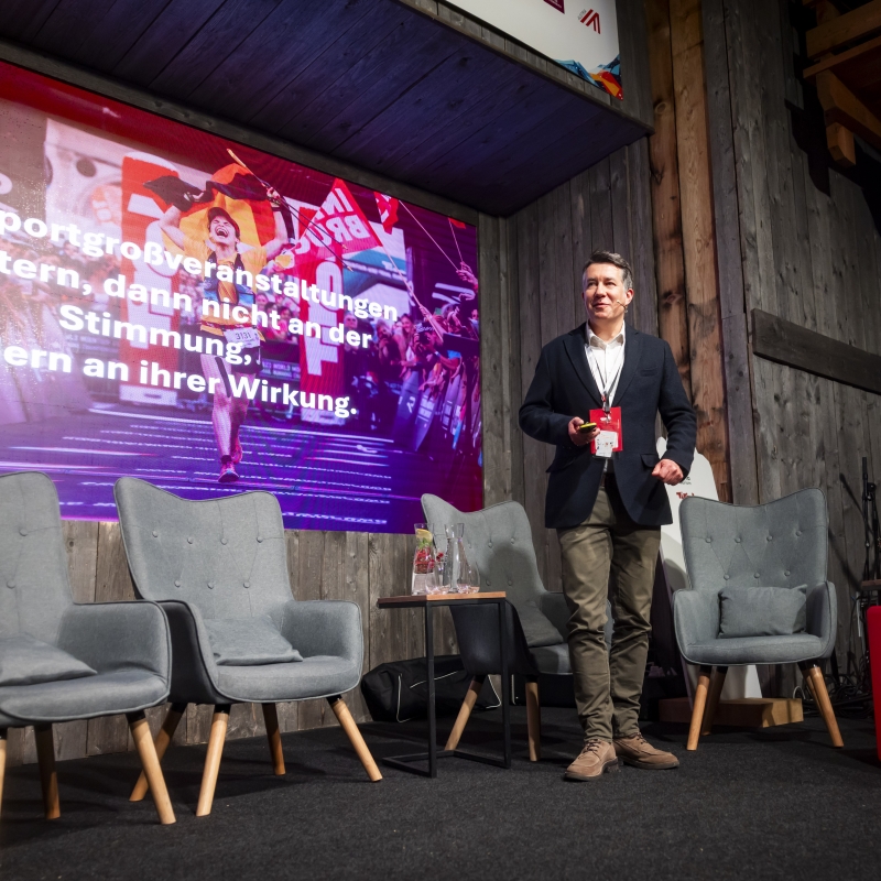 Martin Schnitzer, Univ.-Prof. am Institut für Sportwissenschaft der Universität Innsbruck, gab in seiner Keynote Einblicke in wissenschaftliche Studien zur Wahrnehmung von Sportgroßveranstaltungen.