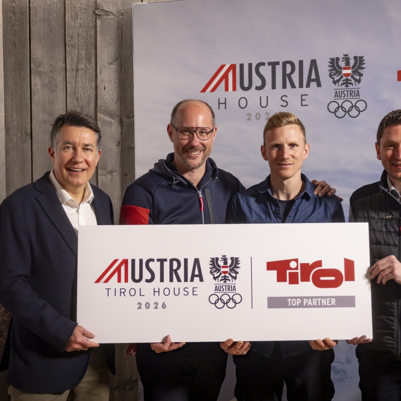 (v.l.): Peter Mennel (ehem. ÖOC-Generalsekretär), Mario Gerber (Landesrat für Wirtschaft, Tourismus und Digitalisierung), Janine Flock (Goldmedaillengewinnerin Skeleton), Karin Seiler (Geschäftsführerin der Tirol Werbung), Martin Reiter (Geschäftsführer der Lebensraum Tirol Gruppe), Horst Nussbaumer (ÖOC-Präsident), Florian Gosch (ÖOC-Generalsekretär).