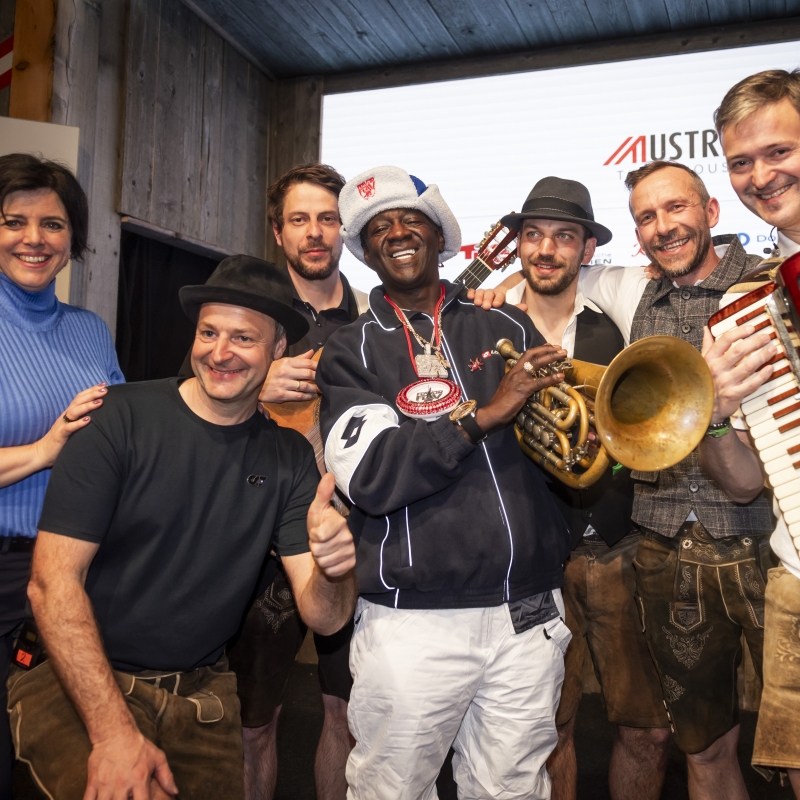 Und plötzlich war er da und veredelte den Tirol-Abend anlässlich der Olympischen Spiele in Cortina mit viel internationalem Flair: der US-Rapper Flavor Flav, einst Mitglied der weltweit bekannten Hip-Hop-Formation „Public Enemy“. Der Abend im Austria Tirol House begeisterte den Musiker so sehr, dass er sich spontan zu einem Auftritt entschloss. Sofort sprang der Funke über, verwandelte das Austria Tirol House in eine Konzerthalle und sorgte einmal mehr für Begeisterung an diesem Abend, der die Urlaubsregion Tirol nicht nur als beliebte Wintersportdestination auf der olympischen Bühne, sondern auch als Hotspot im Sommer zeigte.