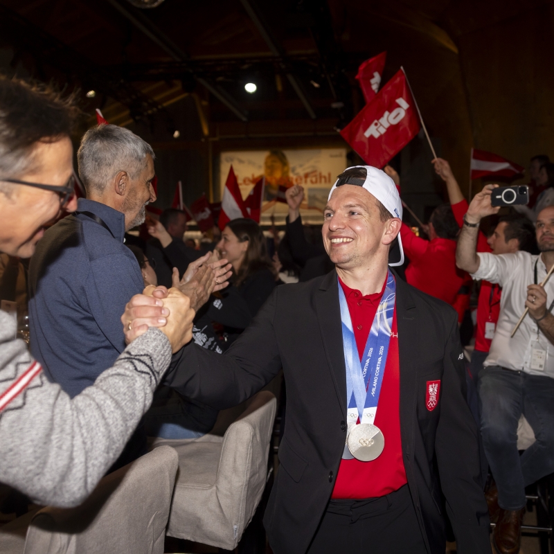 Wolfgang Kindl (Medaillengewinner Rodler) beim Einzug in das Austria Tirol House.