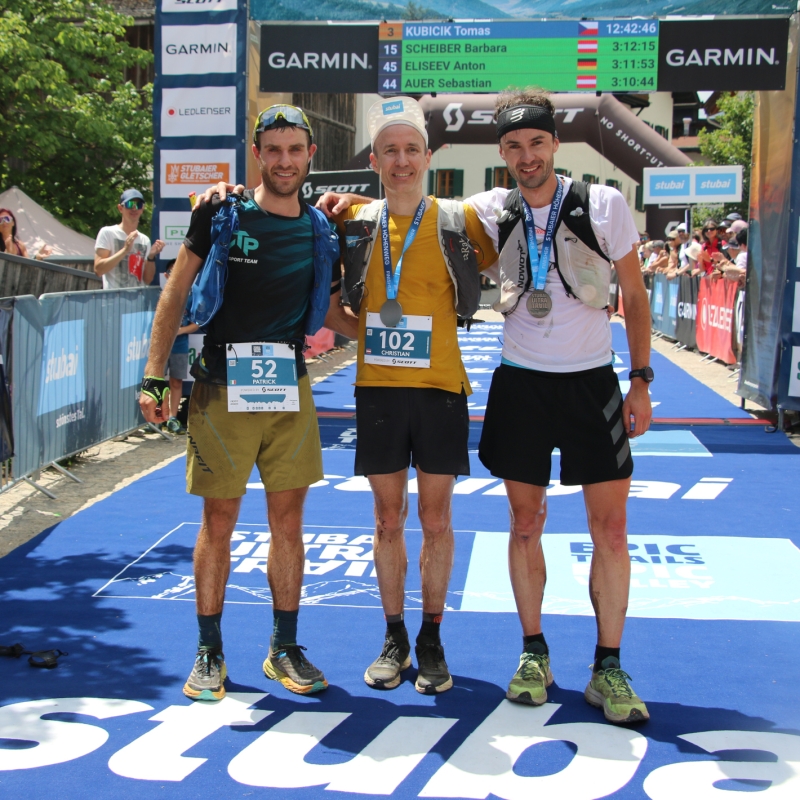 v.l.: Patrick Ramoser (2. Platz, ITA), Christian Stern (1. Platz, AUT) und Tomas Kubicik (3. Platz, CZE) gaben auf dem Stubaier Höhenweg alles.