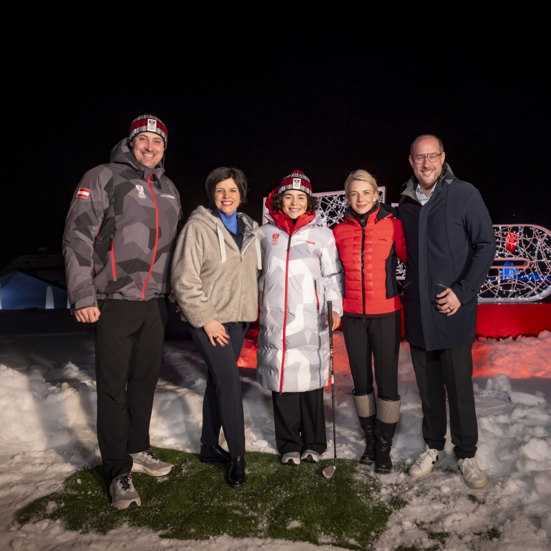 (v.l.): Florian Gosch (ÖOC-Generalsekretär), Karin Seiler (Geschäftsführerin Tirol Werbung), Julia Scheib (Ski-Star), Viktoria Veider-Walser (Geschäftsführerin Kitzbühel Tourismus) und Mario Gerber (Wirtschafts- und Tourismuslandesrat Tirols).