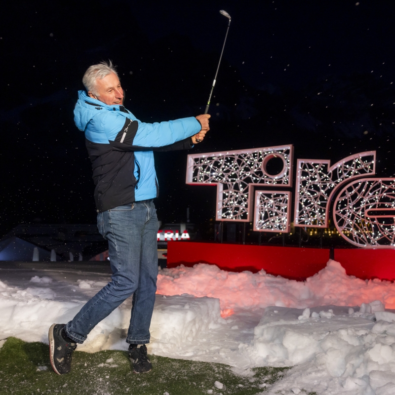 Olympiasieger Leonhard Stock beim symbolischen Abschlag von Cortina nach Kitzbühel zu den Austrian Alpine Open, die im Mai 2026 stattfinden werden.