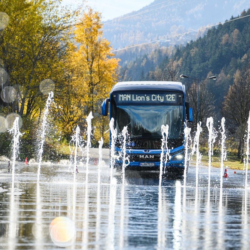 Der E-Buss von MAN während einer Testfahrt auf nasser Fahrbahn.